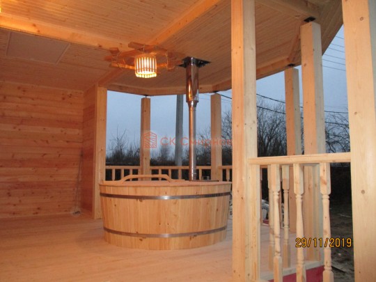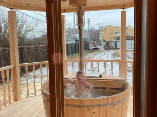 Купель расчитана на 3-4 человека. Оснащена погружной печью и тентом. Нагревается за 3 часа, остывает примерно 5 часов.