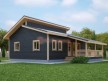 На фото представлен проект деревянного дома №297 габаритами 10х12.5 метров и отличной планировкой общей площадью 102 квадратных метров. Можно выделить несколько особенностей проекта: терраса, туалет, ванная, санузел, сауна. Это современный одноэтажный коттедж с отлично продуманной планировкой. Есть два входа на разные стороны, один из которых выходит на крытую террасу. Кухня объединена с гостиной, 2 спальни изолированы друг от друга.